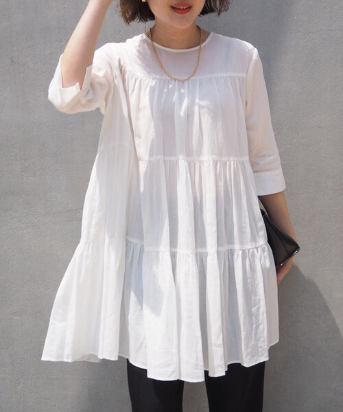 *Detail* 柔らかなコットン素材を使用した、ティアードデザインのチュニック。 分量を調整し、広がりすぎずすっきり見えるシルエットに仕上げました。 大人のリラックス感と女性らしさを兼ね備えた一枚です。 *Coordinate* 細身のデニムやテーパードパンツと好相性。 トップスにボリュームがあるぶん、ボトムはすっきりまとめてバランス良く。 アクセやバッグで少しアクセントを加えるのがおすすめです。 ※商品画像は、光の当たり具合やパソコンなどの閲覧環境により、実際の色味と異なって見える場合がございます。あらかじめご了承ください。 【商品のお気に入り登録】 完売カラーの再入荷通知や、ラスト1点の通知、プライスダウンしたセール通知も受け取ることができます。 【ブランドのお気に入り登録】 新作や再入荷等、いち早くブランドのお得な情報を受け取ることができます。