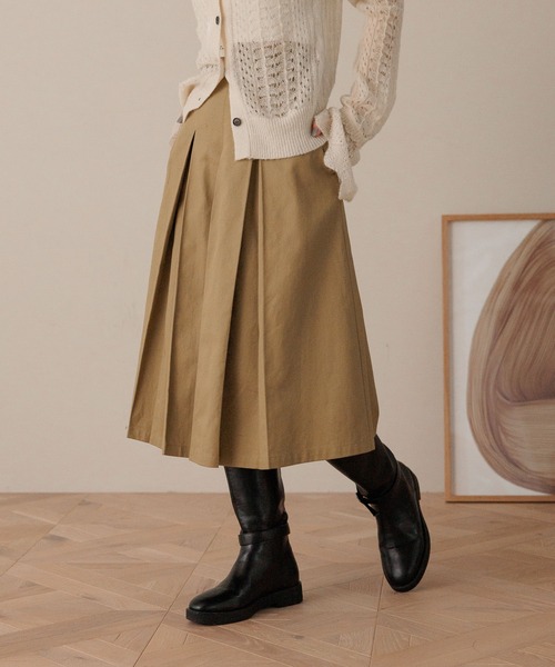 ■素材■ 程よいハリ感と、やわらかな風合いをあわせ持つコットン100%のチノ素材を使用した、ワイドシルエットパンツ。 ワークテイストを感じさせながらも、素材のやさしいタッチでカジュアルすぎず、どこか品のある印象に仕上げました。 ■デザイン■ スカート見えのミディ丈のパンツ。 腰回りはすっきりさせてミドルヒップからタックを施して裾にかけて広がるシルエットに仕上げました。 左脇にファスナーが付いているので着脱も楽にしていただけます。 ■スタイリング■ トップスはニットや裏毛などカジュアルな合わせがおすすめ。 ミドル丈のボトムなどで靴下で遊んだり、足元はローファーで合わせると今年らしい着こなしに◎ .