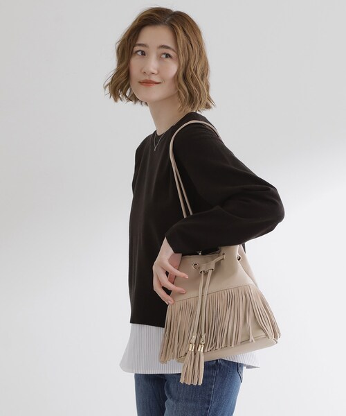 【デザイン】今年注目のスエード素材のフリンジ巾着ショルダー。フリンジは本スエード、本体は合成皮革のコンビ素材です。巾着紐のタッセルの揺れるデザインもポイントです。背面にファスナー付きのポケットもついております。コンパクトながら必要最低限の荷物はしっかり収納できます。【仕様】・ポケット数:内側×2※照明の関係により、実際よりも色味が違って見える場合があります。また、パソコン・スマートフォンなどの環境により、若干製品と画像のカラーが異なる場合もございます。【25AW】店舗へのお問い合わせ商品番号:769-04046●製品寸法:00:高さ23cm 幅(上部)19cm 幅(下部)22cm マチ15cm ショルダー対応サイズ65~121cm備考:重量:約495g(サンプルサイズ)