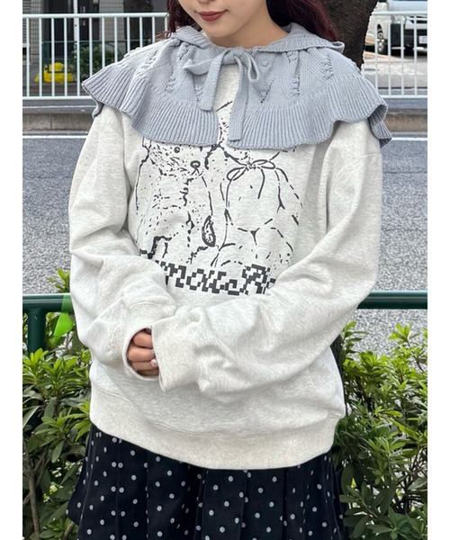 ケープとフードが合わさったような、付け襟感覚で取り入れられる寒い時期にぴったりのitemです。 柔らかなフリル裾やあご下のリボン、ぽんぽんとした透かし柄でかわいらしさをたっぷりとプラスしました。 アウターの上からでも着脱しやすく、デコラティブに彩ってくれます。
