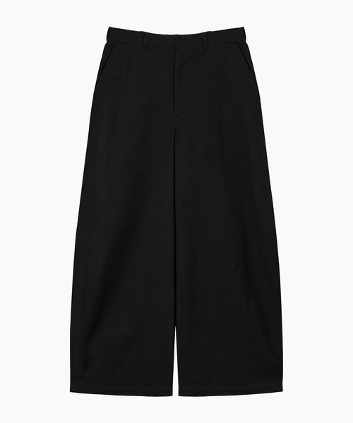 コットンとCORDURA®ナイロンの混紡糸を使用した、チノ素材のラウンドパンツ。ヴィンテージのU.S.ARMYチノをベースにしながら、CORDURA®混紡糸によって耐久性を高めています。生地を揉み込む加工を施し、味わい深く、豊かな風合いに仕上げています。ボリュームのある超ワイドフォルムから膝下にテーパードを効かせたラウンドシルエットが特徴です。ヴィンテージライクな風合いにマッチするマーベルト仕様で仕立てています。