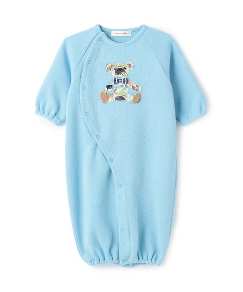 リバティファブリックス「Queue for the Zoo(キューフォーザズー)」を使用したカバーオールです。 蝶ネクタイを身に着けている、テディベアのアップリケに心惹かれます。 ボタンの留め方によって、ドレス型とパンツ型に変化する2WAY仕様。 新生児期から6ヵ月弱まで、長く着用できるのもうれしいポイントです。 【おすすめの着用時期は秋冬シーズン】 【透け感】透けない 【生地の厚さ】厚い 【伸縮性】あり 【裏地】なし 【ポケット】なし 【アジャスター】なし