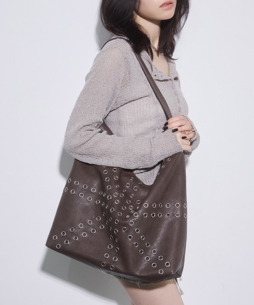 ■ディティールアイレットデザインがエッジが効いておりスタイリングのアクセントになるバッグ。大きめのサイズ感で大容量なのも嬉しい。中には内ポケットが2つ付いており、実用性もばっちりです。▼商品のお気に入り登録完売カラーの再入荷通知や、ラスト1点の通知、セールの通知など商品の情報をいち早く受け取ることが出来ます。▼ブランドのお気に入り登録新商品や再入荷等、いち早くブランドのお得な情報を受け取ることが出来ます。