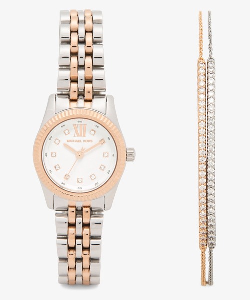 ローズゴールドとシルバートーンをミックスし輝くパヴェで彩った LEXINGTON パヴェ ツートーン ウォッチ アンド ブレスレット ギフトセット。お揃いのカラートーンでパヴェを敷き詰めた2レーンのブレスレットをセットにしています。面取りされたトップリングに丸い文字盤と煌びやかなストラップを備え、ブレスレットと重ねづけすることで腕元からリュクスなフェミニンムードを演出。COLOR:ローズゴールド■ウォッチトップ(縦):2.7cm トップ(横):2.7cmベルト幅:1.2cm 腕周り(最大):17cm■ブレスレット(2本共通)腕周り:22cm 幅:0.1cm〈ご注意〉・商品ご購入時はモニター電池使用のため、お受け取り時に電池が切れている可能性がございます。不良品ではございませんので返品・交換はできかねます。(電池交換は修理対応となります)・修理の際は商品同梱の「保証内容説明書(Warranty information)」と、ZOZOTOWN発行の「納品書」が必要になります。納品書はお買上日を証明する書類となりますので大切に保管して下さい。・製造シーズンにより刻印、ライニングやパーツなどの一部仕様が画像と異なる場合がございます。〈使用方法・商品仕様・修理に関する問い合わせ先〉エフジェイサービスセンター (フォッシル ジャパン)電話 03-4520-2361 (平日11:00 - 13:00 / 15:00 - 17:00)【メンズ商品はメンズショップ(MICHAEL KORS MENS)でご購入いただけます】商品画像の色調・仕様について・お使いのモニターやスマートフォンの機種・設定、お部屋の照明などにより、実際の商品と色調の差が生じる場合がございます。・商品画像はサンプルを撮影しています。実際の商品と、パーツなどの一部仕様に差が生じる場合がございます。・総柄商品について:裁断箇所により、商品一点ごとにパターン(柄)が異なるものがございます。・皮革使用商品について:裁断箇所により、部分的に質感等に若干の差が生じる場合がございます。