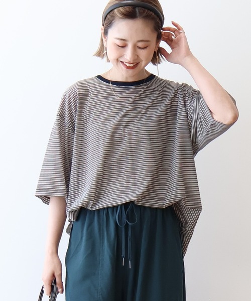レトロ配色ボーダーに細めのトリミング衿を合わせたトレンドライクなプルオーバー。滑らかな表面感とドライタッチな肌触りで着心地良く、まだ暑さの残る時期から秋まで長く活躍します。カジュアルながらも程よいシアー感が女性らしさを演出。薄手なのでボトムインしてもすっきりとまとまります。さらりと着るだけで旬テイストなスタイリングに仕上げてくれるおすすめのアイテムです。透け感[ややあり]生地の厚さ[薄手]光沢感[なし]伸縮性[ややあり]裏地[なし]ポケット[なし]※モデル着用画像は、光の当たり具合で色味が違って見える場合がございます。※商品の色味は、物撮りの画像をご参照ください。●AMERICAN HOLIC ● (アメリカンホリック)大人の女性の毎日を軽やかで豊かにするブランド。カジュアルなのにオシャレ、コーディネートも楽。ONにもOFFにも等身大で楽しむオトナの日常着をテーマに、スタイリッシュかつ自然体を楽しめるカジュアルスタイルを提案します。 ▼ 商品のお気に入り登録がおすすめです ▼商品ページ内のハートマークをクリック。完売時の再入荷や、最後の1点の通知、お得なお値下げの際の通知を受ける事ができます。【お知らせ】ページでも通知が確認できます。