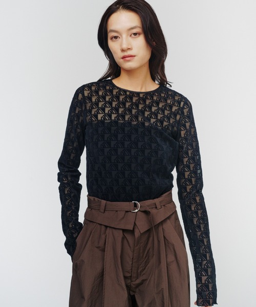 TTMモチーフのモノグラム柄のチュールトップス 伸縮性のあるソフトチュールにブランドモノグラム柄をフロッキープリントで表現したユニークな一枚。タイトな襟ぐりとクロップド丈とのバランスに拘ったコンパクトなトップスです。一枚でポイントとなるトップスはスタイリングのアクセントに。 詳細 透け感:あり 裏地:なし 伸縮性:あり 光沢感:なし 生地の厚さ:薄い MATERIAL メッシュ状のポリエステルチュール素材に、極短い毛足のあるフロッキープリントをブランドモノグラム柄で乗せました。