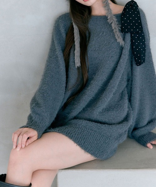 アレンジ次第でいろんな着こなしが楽しめるニット■デザイン・ふわふわシャギーニットに、大きなリボンをあしらったガーリーデザイン。・リボンは肩、前、後ろ、ホルターネックとアレンジ自在で、前後2wayだから着こなしの幅も広がります。・ゆったりシルエットで体型カバーしつつ、女の子らしい可愛さも叶います。・シャギー素材なのでふわふわで、毛玉もできにくく長く着用していただけます。■カラー・オフ/サックス/ピンク/チャコールの4色展開■スタイリング・ミニボトムを合わせてガーリーなミニワンピース風に着こなすがおすすめ。・足を出したくない方はすっきり目のシルエットのパンツを合わせるとバランスよく着れます。・スニーカーやキャップなどでカジュアルダウンさせても、抜け感が出てかわいいです。-----------------------------裏地:なし光沢感:なし透け感:なし伸縮性:あり手洗い:可能タンブラー乾燥:不可アイロン:110℃まで-----------------------------model:161cm ※着用、お取り扱いの際は、商品についている品質表示とアテンションタグを必ずご確認下さい。※ご覧のモニター環境や撮影環境により実際の商品と多少色味が異なって見える場合がございます。ご理解の程よろしくお願いいたします。※引っかけ注意・粗い組織のものや、表面に凹凸があってルーズな組織のもの表面に糸が浮き出ているものは、ちょっとした不注意から引っかけてしまいがちです。取り扱いの際は取り扱い絵表示確認の上、十分注意してください。・着用時にベルトや、バックや周囲の壁など表面の粗いものとの摩擦や引っかかりに注意してください。・水洗いやクリーニングの際にも他の物ものとの引っかかりに注意して下さい。■お気に入り登録のおすすめ【気になるアイテムを登録】ハートをクリックしてお気に入りに登録すると完売カラーの再入荷やラスト1点の通知、セールの通知を受けとることができます。【ブランドを登録】新商品や再入荷、セール通知など、いち早くブランドの情報を受けとることができます。