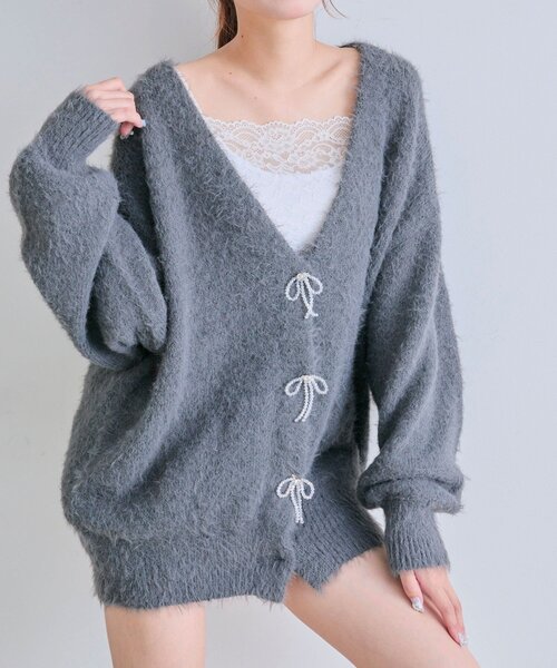 ふわふわシャギーとリボンで着るだけで可愛くなるカーディガン■デザイン・さりげなくきらめくビーズリボンが、コーデを華やかにしてくれるフェミニンデザイン。・リボンビジューは取り外し可能なので、その日の気分に合わせて付け替えができます。・お尻がすっぽり隠れるゆったりとしたサイズ感で、羽織るだけでこなれ感が出ます。・シャギー素材なのでふわふわで、毛玉もできにくく長く着用していただけます。・ドロップショルダーで肩まわりを拾わず、華奢見えも期待できます。■カラー・オフ/サックス/ピンク/チャコールの4色展開■スタイリング・インナーにはホルターキャミ(商品番号:1052060200)などカップ付きのものがおすすめ!・寒い時期はハイネックインナーやテレコインナーをレイヤードしても◎・ボトムはスカート合わせでガーリーにも、デニムやスウェットパンツ合わせでカジュアルにも合います。・キャミワンピースの羽織りとしても活躍します。-----------------------------裏地:なし光沢感:なし透け感:なし伸縮性:あり手洗い:可能タンブラー乾燥:不可アイロン:110℃まで-----------------------------model:161cm ※着用、お取り扱いの際は、商品についている品質表示とアテンションタグを必ずご確認下さい。※ご覧のモニター環境や撮影環境により実際の商品と多少色味が異なって見える場合がございます。ご理解の程よろしくお願いいたします。※引っかけ注意・粗い組織のものや、表面に凹凸があってルーズな組織のもの表面に糸が浮き出ているものは、ちょっとした不注意から引っかけてしまいがちです。取り扱いの際は取り扱い絵表示確認の上、十分注意してください。・着用時にベルトや、バックや周囲の壁など表面の粗いものとの摩擦や引っかかりに注意してください。・水洗いやクリーニングの際にも他の物ものとの引っかかりに注意して下さい。■お気に入り登録のおすすめ【気になるアイテムを登録】ハートをクリックしてお気に入りに登録すると完売カラーの再入荷やラスト1点の通知、セールの通知を受けとることができます。【ブランドを登録】新商品や再入荷、セール通知など、いち早くブランドの情報を受けとることができます。