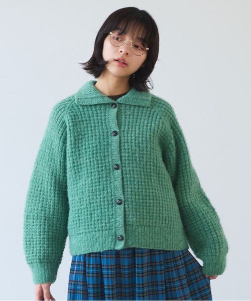 通常のNHKに使用する糸とは異なる紡績の仕方でふわふわと起毛させた糸を使って、立体感のある編み地が目を惹くワッフル編みのニットジャケットをつくりました。ほどよくゆとりのあるシルエットに、クラシカルな襟を添えて、羽織るだけでやさしい存在感をプラスしてくれる一枚です。しっかりとした素材感でアウターライクにも着られ、秋口から春先までロングシーズン活躍。いつものデニムやスカートにさらっと重ねるだけで、ナチュラルな抜け感を演出できます。============================透け感:なし裏地:なし伸縮性:あり光沢感:なし============================※素材の特性、お取り扱いの注意アイロン可・・・あて布使用・こちらの製品は原産国にて原材料から生産しております。そのため獣毛特有のにおいがある場合がございます。ひとつひとつ手編みで生産しております。サイズに微妙に違いますがこちらの製品の特徴としてご了承下さい。・ピリングとは…繊維の表面が、着用中こすられたり、もまれたりするため、毛羽の小さなもつれが絡み合い、次第に大きくなって出来た毛玉のことです。これは、素材風合いの特性上、着用の際避けられない現象で、その発生を完全に防止することは出来ません。・ピリングにはお手入れが必要です。毎日同じ商品を、お手入れなしで着用しますと、必ずピリングは出来やすくなります。1日着用したら何日か休ませるなど、ローテーションを考えて着用して下さいます様お願い致します。ピリングが出来ましたら引っぱって取ろうとせず、ブラッシングするか、小さなハサミで丁寧に取り除いて下さい。・やわらかく、とても暖かい素材です。大切に着用して下さいます様お願い致します。・乱暴に扱いますと、破損しやすく、引っ掛けが起こりやすいので、着用中、着脱時には十分御注意下さい。bulle de savon(ビュルデサボン)BRAND CONCEPT女性、誰もが ふっと子供の頃を思い出し 少女のような気持ちに戻れる服。 bulle de savon =シャボン玉の事 石鹸の泡とか、においなど、 懐かしい感じ。設立年月日 1994年8月※ホワイト、グリーンはサンプルです。実際の商品と仕様・加工・サイズ等が若干異なる場合がございます。※モデルの着用画像は光の関係で商品の色味が若干異なります。※取り扱いの注意については取り扱い表示をよくご確認の上、着用をお願いいたします。※工場の生産の都合上、入荷の時期が前後する場合がございます。ご了承ください。