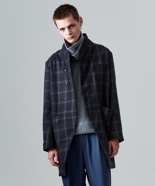 静謐なシルエットの中に変化あるパターンワークを散りばめ、上質なアウタースタイルを提案するBlue Noise Stand Collar Coat。チェスターコートをベースとしながら、衿のデザインは立てても折り返してもスタイリング可能な2WAY仕様。ウエスト位置のポケットは身頃のシームを用いたミニマルな作りとなる他、前身合わせのAライン状のカッティングや脇下のリブ切り替えなど随所にディテールを散りばめました。テキスタイルは無地のBlackとチェックのGrayをラインナップ。一見プレーンのようでありながら、眺めるほどに変化に気づく、“Blue Noise”ならではの仕上がりをお楽しみください。