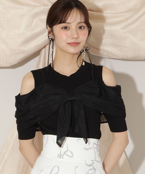 ドッキング風リボンで甘すぎない、大人の可愛さ【Design】・チュール素材のリボンビスチェをドッキングしたようなデザインは、秋にぴったりなニット素材で登場♪・肩の肌見せが、抜け感を演出しつつ大人の可愛さをプラス。・リボンはリブニットにしっかり縫い付けられているので、ずれにくく安心して着られます◎・同色系のリブニットとリボンの配色が、落ち着きのあるフェミニンさを引き立てます!・王道のフレアスカートとの組み合わせはもちろん、パンツを合わせた甘辛ミックスなスタイリングもおすすめです♪【Fabric】・柔らかいリブニット素材を使用。・ご自宅でお手入れが出来るのも嬉しいポイント♪・ホワイト、ピンク、ブラウン、ブラックの4色展開となります。【Care】手洗い可能F:(00):着丈50cm/身幅33cm/肩幅31cm/袖丈20cm/裾回り30cm