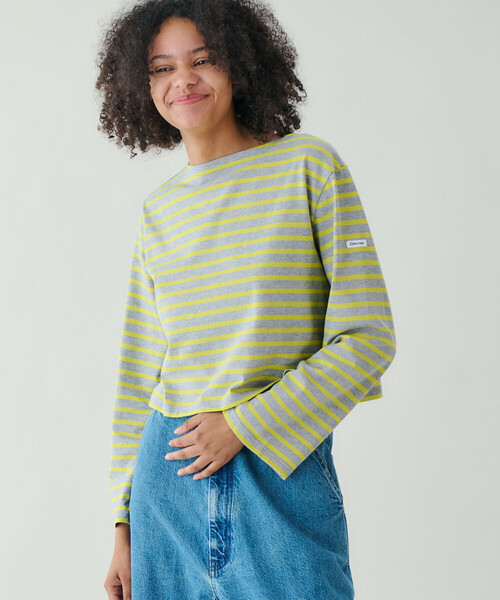 <デザイン>- ボートネックの長袖ボーダーTシャツ- ジャストレングスの着丈- レギュラーフィット- ブランドオリジナルカラーのボーダー柄- フロント裾に蜂のアイコン<素材>- 40番手のコーマコットン糸を双糸にしたコットン天竺- 柔らかな風合い<同生地・型違いの品番>品番:BSB252L103-0024 *5分袖<メーカーカラーについて>GREY系2:OYSTER×COALYELLOW系1:GREY×LIME※着用、お取り扱いの際は商品についておりますアテンションタグ、洗濯ネームを必ずご確認ください。※モデル撮影画像は、光の当たり具合やパソコンなどの閲覧環境によって、実際の色味と異なって見える場合がございます。商品の色味は商品単体で撮影した詳細画像をご参照ください。メーカー品番:#OR-C0490 BFJORCIVAL | オーシバル1939年にフランス・リヨンで設立。1950〜60年代にはフランス海軍の制服としてボーダーTシャツを提供していた、由緒あるマリンウェア・ブランド。