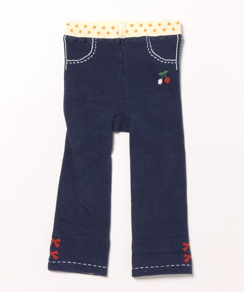 ヒップに大きなmimiちゃんの顔の編み込みの入ったベビーパンツ。抱っこされた時、ハイハイする時、可愛らしさ満点です。また、裾裏は、サクランボの編み込み柄になっているので、折り返しても穿ける仕様。デイリーに、ギフトに、おすすめです。