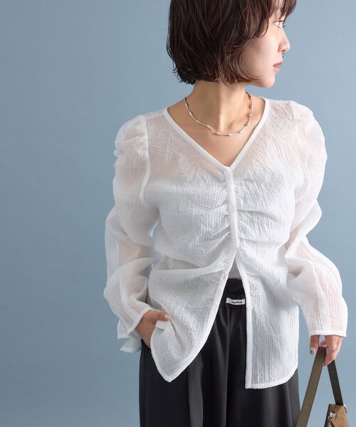 シンプルながらもシャーリングデザインで華やかに♡Vシャーリングブラウスが登場!●デザイン・シンプルなデザインながらも、胸元や袖のシャーリングデザインで華やかな印象に♡・首元がVネックになっており、首元がすっきりと見え、お顔をシャープに見せてくれる効果も◎・前後で着用できる2WAY仕様になっています!●素材軽い着心地でシワになりにくい素材。-----------------------------------------------------洗濯:40度限度 手洗い/石油系ドライクリーニング可アイロン:低温120℃まで スチームなし(あて布使用)タンブル乾燥:不可裏地:なし伸縮性:なし光沢感:なし生地の厚さ:普通------------------------------------------------------●スタイリング・デニムやワイドパンツと合わせて、リラックス感やカジュアル感をプラスした着こなしに◎・フレアスカートやワンピースに羽織って、華やかな印象にも♡・程よい透け感で、インナーとのレイヤードスタイルも楽しめます。●おすすめスタイリングアイテム・カットオフオーバーダイデニム・カーブスウェットパンツ●スタッフ着用コメント身長164㎝ 骨格ストレート・後ろをリボンで結ぶシェイプできるので、スタイルアップが叶います!・程よい透け感なので、女性らしさも表現してくれます◎身長157㎝ 骨格ウェーブ・少し長めのデザインなので、ヒップ周りのカバーが叶うので嬉しいです!・オフホワイト・ブラック・ブラウンとボトムスに合わせやすいカラーです◎------------------------------------------------------商品のお気に入り登録➡ お気に入りアイテムの値下げ・再入荷・在庫1点などの通知を受け取ることができます。ブランドのお気に入り登録➡ 新商品や再入荷、セール、クーポン配布などお得な情報を受け取ることができます。※サイト上のカラー名と、お届け商品に記載されているカラー名が異なる場合がございます。※商品の色味は、撮影場所や光のあたり具合などにより色味が違って見える場合が御座います 。 また、お客様のお使いのPCのモニター環境などにより色味が違って見える場合が御座います。予めご了承の上ご注文下さい。※ご注文いただいた予約商品のお届け時期の確認は、注文履歴ページより行えます。------------------------------------------------------
