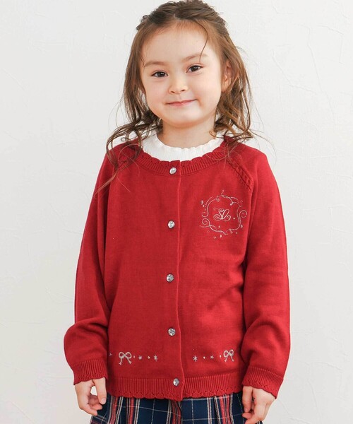 -25AW- 裾口や袖口のスカラップがキュートな女の子用の長袖カーディガン。 ■デザイン 周りと差のつくデザインのアイテムはみんなの注目の的になること間違いなし。 ジュエルのようなキラキラのボタンが女の子心をくすぐるポイントになっています。 フロント部分にはラメ糸の刺しゅうでモチーフをあしらってさりげなくきらめくのがカワイイ♪ ボタンを全部閉めてトップスとして着るのもオススメです。 通園・通学などのデイリー使いから上品なデザインなのでちょっぴりおめかししたい時まで活躍シーンがたくさん! 1日の気温差や室内外の温度差が大きい春夏にピッタリなアイテムです。 着用しないときは肩や腰に巻いても◎ 合わせやすいオフホワイト、パッと目を引くレッドの2色展開です。 ■素材/機能 ニット素材なので伸縮性ばっちりで羽織りやすい。 25秋冬アイテム 【2025 AUTUMN / WINTER Plaid&Play-秋色チェックと遊ぶ-】 伝統的なチェックにビビットなカラーや子どもらしいモチーフをミックス。 動きやすく着心地のいい素材とシルエットで秋の落ち葉の中や秋風吹く中でも思いっきり遊んで冒険しよう。 【2025年 8月のテーマ / suger&Leaves】 ふんわりと優しい秋。 秋の優しい甘さを詰め込んだロマンティックなラインナップ。 フワフワなチュール、ニットなど肌触りのいい素材感と小花やリボン、甘いモチーフで秋風かおるティーパーティーのはじまり。 【SLAP SLIP(スラップ スリップ)】 ~子どもの欲しいをカタチに~ ヨーロッパのこどものように 子どもらしい今しか着れないナチュラルなかわいさを提案 どこか上品で清楚感漂うフレンチカジュアルは いつものコーディネートをさりげなく格上げ