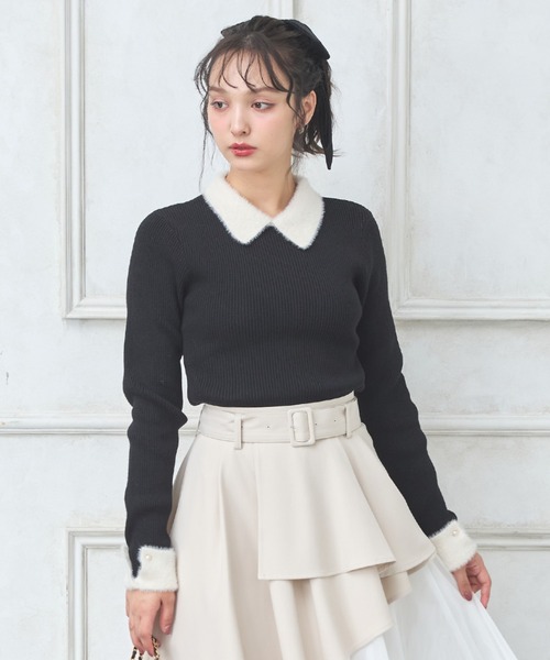 ★WEB限定アイテム★ 【襟と袖をフェザーヤーンで仕立てたフェミニンなニット】 ▼Design 襟と袖のふんわり柔らかな配色フェザーヤーンニットがポイントのニットです。 毛足の長いフェザーヤーンの配色でアクセントをつけ、上品な印象に仕上げています。 配色のメリハリの効いたデザインでコーデを華やかに彩ります。 袖口のフェザーヤーンにはパールのボタンがついており、手元まで美しく演出。 ボディラインに沿うフェミニンなシルエットでスタイルアップを狙えるのも◎ 程よい裾丈はトップスインスタイルももたつかず、すっきり着られます。 合わせやすいカラーがラインナップ。 ▼Styling ミニスカートやタイトスカート合わせで上品な印象を与えます。 フィット感あるデザインで、ボリュームのあるフレアスカートなどに合わせやすく、メリハリのある着こなしに。 シンプルな配色デザインで、柄物ボトムとの相性も抜群です。 コンパクトな身頃のデザインでトップスインスタイルもすっきり決まります。 きちんと感があるのでオフィスシーンにもおすすめ。 ・ニット製品のため生地に伸縮性があり、サイズに若干の誤差が生じる場合がございます。予めご了承くださいませ。 【以下グレージュ/オフホワイト参考。カラーにより多少の誤差あり】 ・透け感:やや透ける ・伸縮性:あり ・生地の厚さ:普通 ・裏地:なし ▼Recommend ・トップス ・リブニット ・フェザーヤーン ・配色 ・上品 ・フェミニン ・デートコーデ