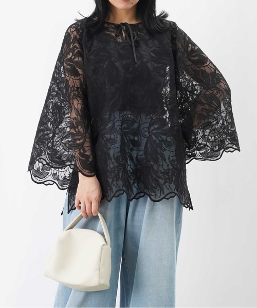 2025 Autumn & Winter【前後2WAYが嬉しいオーバーレースブラウス】◆Designボタニカル柄の繊細なレースデザインが上品なオーバーブラウス。袖口と裾はスカラップで、女性らしく可愛らしいデザインに仕上げました。前後2WAYで、ネックまわりはリボンスタイルかシンプルな浅めのVネックで着用いただけます。オーバーサイズでレイヤードしやすく、シアー素材がトレンドライクな印象のブラウスです。◆Fabric・シアー素材の微光沢生地・刺繍部分は柔らかみのあるコットン100%◆color・アイボリー、ブラックの2色展開です。◆Styling・ワンピースの上から羽織って普段のスタイルにアクセントをプラスしたレイヤードコーデに。・カーブデニムやフレアデニムを合わせてカジュアルに。・チュールスカートやナロースカートを合わせてフェミニンに。--------------------------------生地の厚さ:薄手透け感:あり伸縮性:なし光沢感:ややあり裏地:なし洗濯:ドライクリーニング可--------------------------------【お買い物をよりお楽しみいただくために】〇商品のお気に入り登録完売カラーの再入荷や、完売間近の通知、セールの通知を受けることができます。〇ブランドのお気に入り登録新商品や再入荷など、いち早くブランドのお得な情報を受け取ることができます。【♡をクリック!ご登録お願いします!】