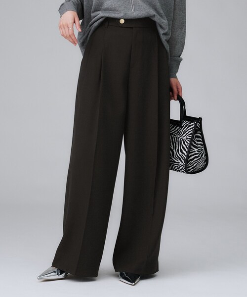 【デザイン】洗練された素材感の2タックワイドパンツは、シンプルながらも存在感のあるデザインで、コーディネートの幅を広げる一着です。センタープレスがキレイ目でスッキリとしたシルエットに見せてくれます。【素材感】特殊なポリエステルの糸を使用した梳毛調合繊。風合いは梳毛ライクな風合いを残しカチオン染めによるシャンブレーのような杢感を演出できるのが最大の特徴。昨今晩夏の気温が高くなっている事によりポリエステルでどこまで秋を表現できるかに拘った素材。まだまだ暑い時期にも対応できるさらっとした素材感で、杢見え表情が秋を感じさせるトレンド素材になっております。接触冷感機能付き。【着こなしポイント】同素材の153-83305とのセットアップです。単品としてTシャツと153-43300とのコーデもおすすめです。【仕様】・ポケット数:横×2 後ろ×2・前ファスナー・ウエスト後ろゴム・裏地なし※照明の関係により、実際よりも色味が違って見える場合があります。また、パソコン・スマートフォンなどの環境により、若干製品と画像のカラーが異なる場合もございます。モデル情報:身長163cm B80 W59 H82 着用サイズ:02(M)店舗へのお問い合わせ商品番号:153-63301●製品寸法:00(XS):W65cm H102cm 股下64cm 渡り幅34cm 裾幅28cm 総丈93cm 01(S):W68cm H105cm 股下72cm 渡り幅35cm 裾幅29cm 総丈101cm 02(M):W72cm H109cm 股下72cm 渡り幅36cm 裾幅30cm 総丈102cm 03(L):W75cm H112cm 股下73cm 渡り幅37cm 裾幅31cm 総丈103cm 04(2LT):W78cm H115cm 股下73cm 渡り幅38cm 裾幅32cm 総丈104cm 42(2L):W82cm H119cm 股下72cm 渡り幅40cm 裾幅33cm 総丈104cm 44(3L):W86cm H123cm 股下72cm 渡り幅41cm 裾幅34cm 総丈104cm 46(4L):W90cm H127cm 股下72cm 渡り幅42cm 裾幅34cm 総丈105cm 48(5L):W94cm H131cm 股下72cm 渡り幅43cm 裾幅35cm 総丈106cm 50(6L):W98cm H135cm 股下72cm 渡り幅45cm 裾幅35cm 総丈107cm 備考: