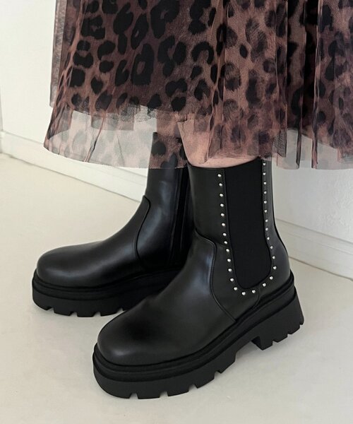 スタッズがアクセントになるショートブーツ●つま先部分も細すぎず、インソールも柔らかく足が痛くなりにくい●厚底なので脚長効果してくれます!●ベーシックなカラー展開で柄・色物とも相性抜群◎●スタッズが辛さをプラスしてくれます!○重さ・Sサイズ・Mサイズ 約410・Lサイズ・XLサイズストレッチショート/ ブーツ/ トラックソール/ 厚底 / 厚底シューズ / ※撮影場所やお使いのモニター環境により若干お色味が異なる場合がございます。特にロケの撮影では明るく見える傾向にございます。 <返品・キャンセルについて>・着用・洗濯後の返品は致しかねます。・商品到着後、着用前に商品を確認して頂きますようお願い致します。