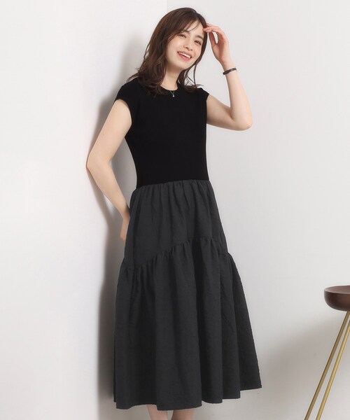 【デザイン】 異素材使いが可愛いドッキングワンピース。 一枚で簡単に上品スタイルが決まります。 忙しい朝にも簡単にコーディネートが完成する時短アイテム♪ 身頃はさらりとした肌触りのニット地で今すぐ着られる素材感。 スカート部分は表情のあるエンボス加工生地を使用した高見えデザイン。 程よくハリ感のある生地なので、ふんわりと綺麗なボリューム感を作れます。 【素材】 ニット部分はさらりとしたタッチ感のハイゲージリブ編みニット。 スカート部分は凹凸のある表面感が特徴のエンボス加工生地を使用。 【仕様】 ・ポケットなし ・裏地なし ※こちらの商品はやや透け感があります。 ※照明の関係により、実際よりも色味が違って見える場合があります。また、パソコン・スマートフォンなどの環境により、若干製品と画像のカラーが異なる場合もございます。 ---------------------------------------- ★お気に入り登録がおすすめ★ ▽気になる商品はハートマークをクリック! ・再入荷やセールの通知をお知らせ ・お気に入り一覧からいつでもチェック ▽ブランドのお気に入り登録も! ・新商品やお得な情報をいち早くお知らせ ---------------------------------------- モデル情報:身長165cm B82 W60 H88 着用サイズ:00(フリーサイズ) 店舗へのお問い合わせ商品番号:P93-53006 ●製品寸法: 00(フリーサイズ):着丈117cm B70cm 肩幅42cm W66~72cm H110cm 備考: