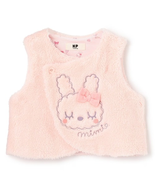 ふんわり軽やかなボア素材のベスト。前身頃には大きなmimiちゃんの顔の刺しゅうに、リボンのモチーフが付いています。裏地には、mimiちゃんとおもちゃの総柄プリントが使われていて、お着替え時間も楽しくなる仕様。秋冬のお子さまの温度調節にぴったりの1枚です。ギフトアイテムとしても最適。