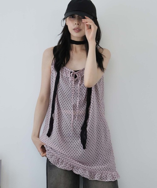 軽やかな透け感と甘すぎないドット柄で 大人フェミニンな雰囲気を纏える一着です。 ■デザイン ・ほんのり透けるシアー素材にドット柄をあしらった、フェミニンなキャミワンピース。 ・胸元や裾に施されたフリルデザインが華やかなアクセントに。 ・華奢なストラップと、ストンと落ちるシルエットで大人可愛い印象に仕上げました。 ・レイヤードスタイルにぴったり、さまざまなシーンで着回しが楽しめるアイテムです。 ■素材 ・軽くてふんわりとしたポリエステル素材を使用。 ・シアー感とドットの凹凸で、1枚で着映えする表情のある素材感。 ・シーズンムードを高める、風を通す軽やかな質感が魅力。 ■スタイリング ・Tシャツやタンクトップとのレイヤードでカジュアルダウンした着こなしもおすすめ。 ・同系色のシアーシャツやカーディガンと合わせて、涼しげで女性らしいスタイルに。 ・キャミソールと合わせてヘルシーな着こなしもおすすめ◎ ・足元はサンダルやスニーカーで、デイリーカジュアルに。 ------------------------------------------------ 【お買い物をよりお楽しみいただく為に】 ▼お気に入り登録 サイズ・カラーを指定して、♡マークをクリック![セール通知・ラスト1点の通知・完売アイテムの再入荷通知]を受け取ることができます。 ▼ブランドのお気に入り登録 新商品や再入荷、タイムセールやクーポン等いち早くブランドのお得な情報を受け取ることができます。 ------------------------------------------------ ※取り扱い上のご注意 染色の特性上、発汗や摩擦により色落ちしたり他のものに色移りすることがありますのでご注意ください。 韓国 オフィスカジュアル ガーリー 大人カジュアル 韓国ファッション 夏服