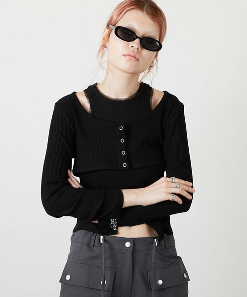 <fabric>適度な伸縮性とフィット感のあるリブカットソー素材を使用。タンクトップとカーディガンはそれぞれリブ幅が異なります。肌なじみがよく、体にほどよくフィットするため、美しいシルエットを引き立てながらも快適な着心地を保ちます。やや厚みのあるしっかりした生地感で、シーズンを問わず活躍する万能素材です。<style>クロップド丈のカーディガンとアシンメトリーでデザイン性の高いノースリーブタンクトップがセットになっており、それぞれ単体でも着用できるアイテムです。カーディガンはラウンドネックでクロップド丈の長袖、前面に5つのスナップボタンが並ぶデザインです。インナーとのレイヤードがおすすめです。ノースリーブタンクトップは、ミニマルながらも一癖あるデザインが魅力です。アシンメトリーに走るカットラインが個性的で、裾部分に向かって生地が自然に重なるようになっています。首元はやや詰まったデザインですがチュールがあることで女性らしさも+、フロント左上にはメタルプレートのブランドロゴが配されています。【led.tokyo/レッドトーキョー】 TOKYOから生まれるファッション・アート・ 音楽・映画・漫画をはじめとした様々なカルチャーからのインスピレーションをコレクションに落とし込んでいます。 TOKYO的なファッション・カルチャーの ミックスアップ・編集感覚はそれぞれのアイテムに落とし込まれ、様々なスタイリングを生み出すことができます。 袖が取り外せたり、前・後ろで着られたり、 ひとつのアイテムから様々な着こなし、無限のスタイリングアイディアが生まれます。 ブランドが考えるルックブック的なスタイルではなく、着る人それぞれが自分だけのスタイルを生み出していく。それが『led.tokyo』の考えです。【お買い物をよりお楽しみいただくために】 ■商品のお気に入り登録(ハートマークをクリック) 完売カラーの再入荷通知や、在庫ラスト1点の通知、セールの通知を受け取ることができます。 ■ブランドのお気に入り登録 新商品がUPされたり売り切れ商品が再入荷したときなど、いち早くブランドのお得な情報を受け取ることができます。是非ご利用頂き、お買い物をお楽しみください。