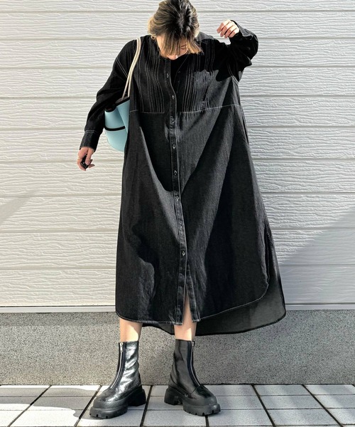 【WEB限定アイテム】胸元のピンタックデザインが目を惹くデニムワンピースです。襟元をバンドカラーですっきりとさせ、ゆとりのあるサイジングで体のラインを拾わずきれいに見せてくれます。便利なポケット付きで機能性も抜群です。ソフトで着心地の良い風合いの素材を使用しているので、デニム特有の硬い印象はなく柔らかい印象に仕上げてくれます。1枚できるのはもちろん、ボトムとのレイヤードコーデもおすすめ。ボタンを開けて羽織としても使える着回しに便利なアイテムです。《インフォメーション》◆商品のお気に入り登録完売していても再入荷時に再入荷通知を受け取ることができますので、是非ご登録ください。◆ブランドのお気に入り登録新商品や再入荷などの情報を受け取ることができますので、是非ご登録ください。