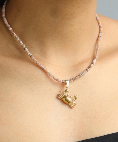 小粒のインカローズを並べた、タイニーシルエットのネックレス。自然のままのグラデーションが美しく、淡いピンクの濃淡が肌にやさしくなじみます。表面はほんのりキラキラと輝き、軽やかな存在感に。さりげなく揺れるのは、小さなクラブ(蟹)のチャーム。「前にしか進まない」と言われるクラブは、前向きな象徴としても人気のモチーフ。ユニークなモチーフはコーディネートのアクセントにもおすすめです。インカローズ(ロードクロサイト)みずみずしいピンクが印象的なインカローズは、“愛と癒しの石”と呼ばれています。心をやわらかくほぐし、自分自身を大切にする気持ちを思い出させてくれる存在。落ち込んだときや、優しい気持ちになりたい日にそっと寄り添ってくれます。天然石ならではのピンクの濃淡や模様がひとつひとつ異なり、唯一無二の表情を楽しめるのも魅力。肌にのせたとき、ふんわりと華やかなムードを添えてくれます。着脱がしやすいマグネットタイプの留め具に、サイズ調整ができるイージーアジャスターつき。ひとつでも、重ねても。気分にあわせて楽しめる1本です。デリケートなお肌の方にもおすすめ。025035(直営)Materials : 天然石、24kgf stainless※繊細な作りですので、強い衝撃、引っ掛けなどにご注意ください。※天然パーツの色味や大きさには若干の個体差があります。また、パールや天然石ビーズの柄は1つづつで方が異なり、内包物や色味の違いも風合いの一つとしてお楽しみいただければと思います。天然パーツのサイズは均一で無い場合があります。全体のバランスを考えて作成いたしますので、粒数などが多少前後することがあります。TUWAKRIM独自のイージーマグネットアジャスター。【ネックレスの着用方法・長さ調整について】1.ネックレスの両端に付いているマグネットパーツを近づけると、カチッと簡単に装着できます。2.長さを調整したい場合は、引き輪(丸い金具)に延長チェーンをゆるませながら掛けることで、お好みの長さに調整できます。3.お好みのフィット感に合わせて、引き輪に掛けるチェーンの位置を変えてください。4.外すときは、マグネット部分をやさしく引き離してください。※ご使用後はマグネット部分に無理な力をかけないようご注意ください。保管時はマグネット同士を付けた状態にしておくと、絡まりにくくおすすめです。
