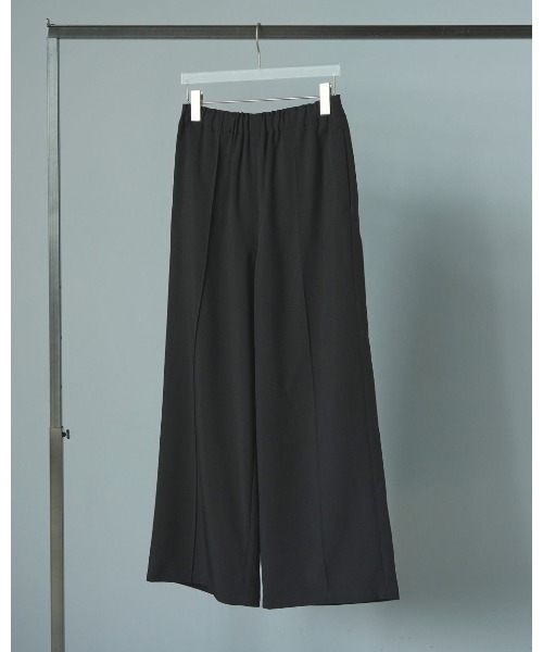 ポリエステル99% ポリウレタン1%ウエストゴムでラフに履いていただけるワイドパンツ。ドライタッチで落ち感のある綾目素材を使用し、イージーに履けながら上品見えする一本です。ブラウンとベージュは杢調で、ニュアンスがある生地です。ピンタックのセンターラインを入れ、スッキリとした印象に履けるワイドシルエット。ウエストの内側には共布紐が通っているので、お好みのサイズに調節可能です。ローウエストで履いて、Rib Biker Pantsをウエストからチラ見せしたレイヤードスタイルもおすすめです。