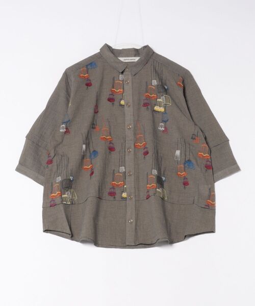 ランプの刺繍がかわいらしい、先染めチェックのシャツカラーブラウス。 袖と裾に切り替えを入れ、レイヤー風のディテールに仕上げたデザイン性のある1枚です。 生地は、細番手のコットン糸で細かい千鳥柄のテキスタイルを織り上げ、ユニークなランプの刺繍を施しました。 ランプシェードのフリンジ部分は、刺繍後に溶剤を溶かすことで立体感を出す、オンケミ刺繍という技法を使用しています。 肘が隠れるくらいの袖丈で、ロングシーズンで活躍する1枚です。 お手入れ:手洗い 店舗へお問い合わせの際は、下記の品番をお申し付け下さい。 [品番:34150453]