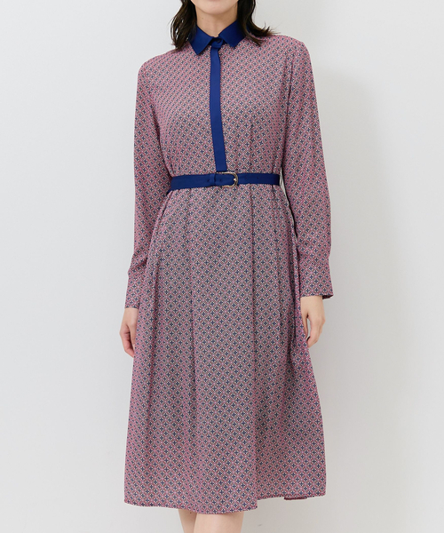 タイルのような多色使いの幾何柄サテンが目を惹くワンピース。襟と比翼の前立ては無地配色に切り替え、メリハリ感をプラス。ベルトが付属しており、ウエストマークすることで脚長効果も後押ししてくれます。綺麗に広がるフレアシルエットがエレガントな女性らしい美スタイルを演出。休日のお出かけや、ジャケットを合わせて仕事にと幅広いシーンにも活躍してくれるアイテムです。 ・カラー展開はボルドー、ネイビー ・サイズ展開は1(M)9号・3(2L)13号