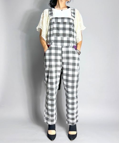 【ユニークで遊び心たっぷり】チェック柄ネコしっぽ付きオーバーオール カジュアルなのにインパクト抜群!個性的なデザインが魅力のオーバーオール。 胸元とポケットの内側には、左右で色違いのチェック生地を使用し、ポップでキュートなアクセントをプラスしています。 背面には注目のポイント、黒のネコしっぽ付き! さらに、左右のポケット上にはリボン型の切り替えもあり、まるで後ろ姿が猫のようなデザインに仕上がっています。