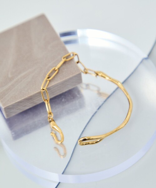 艶感とスリムなデザインが魅力的なアソートバングル。【デザイン・シルエット】 ・ステンレス製のデザインバングル&ブレス。 ・チェーン切り替えのブレスレットと、スライド式バングル2型のアソート展開。 ・いずれもモードな印象のデザイン。 【カラー】 ・ゴールドとシルバーの2色展開。 【スタイリングポイント】 ・袖を折り返したシャツスタイルの腕もとにスマートに合わせて。 ・腕を出す、夏場のジレスタイルにもぴったり。 ・チェーンタイプは、手持ちの腕時計やブレスレットとの重ねつけもおすすめ。 ※撮影時の光、お使いのモニター環境によって色の見え方が違う場合がございます。