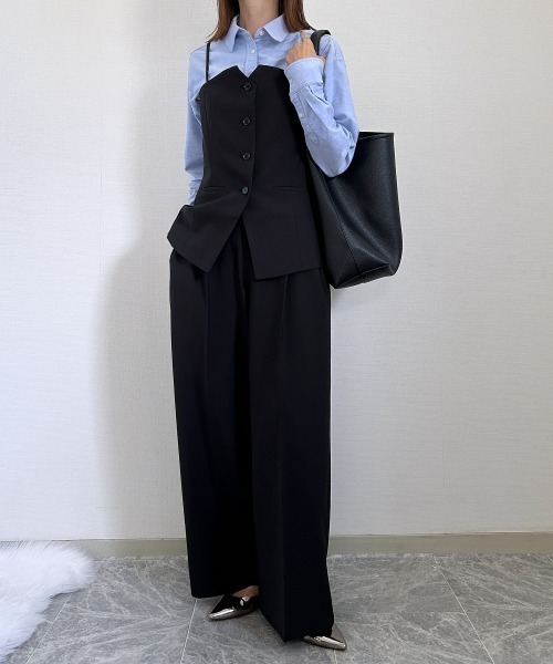 ★大人気インスタグラマーみさとさんとのコラボアイテム登場★フォロワー数18万人超え!プチプラアイテムを高見えさせるセンスの良さと高身長を活かしたきれいめコーデ提案で大人気のインフルエンサー。働く服との初コラボは「おしゃれ」と「きちんと」を兼ね備えたきれいめセットアップを展開します。【みさとさんコラボ】フロントボタンビスチェ”わたしが着たい”を形にしました!「ウエストをすっきり見せたい」「でもラクでいられるのがいい」そんな想いから生まれたビスチェです!■デザイン着るだけでくびれ見せ。大人映えビスチェ・ウエストシェイプできゅっと細見え・ゴム仕様でバストサイズも調整OK くびれシルエット、自在にコントロール・バスト下で切り替え&ゴム絞りで立体感アップ・ウエストのシェイプ効果でスタイルアップ見え■素材高見え素材で、動きまできれい・落ち感のあるドレープ素材でふとしたしぐさまで美しく。 程よくストレッチの効いた素材で着心地も◎【みさとさんコラボ】センタープレスタックワイドパンツ”脚がきれいに見える”にこだわりました・「ワイドなのにすっきり見える」・「丈感も選べて自分に合うが見つかる」そんな想いで完成した美脚パンツです!■デザイン美脚も、ラクも、あきらめない・キレイ見えするのに、程よくストレッチがきいていて楽ちん・センタープレスで脚長バランス◎・レギュラー丈、ロング丈と股下サイズが選べる シルエット美人を作る1本・ストンと落ちる美ラインシルエット・センタープレスで縦ラインを強調・気になる腰回りもすっきり見せ■素材高見え素材で、動きまできれい・落ち感のあるドレープ素材でふとしたしぐさまで美しく。 程よくストレッチの効いた素材で着心地も◎■おすすめのスタイリング・同素材のジャケット・ビスチェとのセットアップ使いでシックに。 どんなテイストにも投入OK♪■同素材のシリーズはこちらテーラードジャケット(単品):DHU0125D0008タックワイドパンツ(単品):DHU0125D0010カーブウエストタイトスカート(単品):DHU0125D0011ビスチェ・タイトスカート:DHU0125D0007<洗濯方法>洗濯機OK ネット使用■キーワード7days、夏、秋、セレモニー、レイヤード、同窓会、結婚式、二次会、オケージョン、食事会、オフィスカジュアル、通勤、着回し、卒園式、卒業式、入園式、入学式、、入卒、セミフォーマル、上下セット、パンツスーツ、ビスチェ、きれいめ、きれいめカジュアル、オンオフ兼用、
