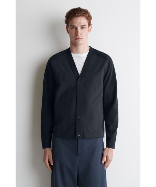 万能なネイビーカラーで展開するこのモダンなカーディガンは、フロントの織りパネルが、同系色のニット素材のバックと絶妙なコントラストを生み出しています。シルバートーンのスナップボタンがモダンな仕上がりを演出しています。 (レギュラーフィット、プレススタッド留め) 織りパネル:リサイクルポリアミド(リサイクルナイロン)68%、コットン32%。ニットパネル:コットン100%。 トリムを除く / 洗濯機洗い Mサイズの背面長は64cmです。モデルはMサイズを着用しています。