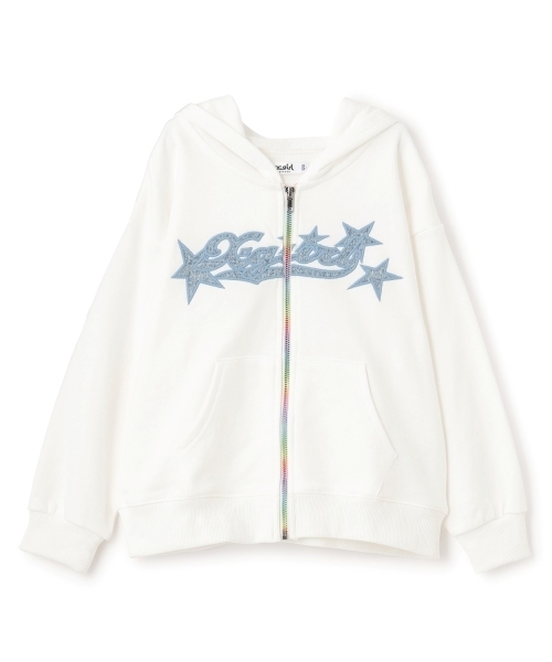レインボーファスナーが特徴的な裏毛仕様のジップパーカです。 ヴィンテージ感のあるピグメント加工のデニムパッチロゴは、レディースとのリンクデザイン。 アウター代わりにサッと羽織れる便利なアイテムです。 内側にお名前を記入できるタグがついています。 【透け感】透けない 【生地の厚さ】厚い 【伸縮性】あり 【裏地】なし 【ポケット】あり