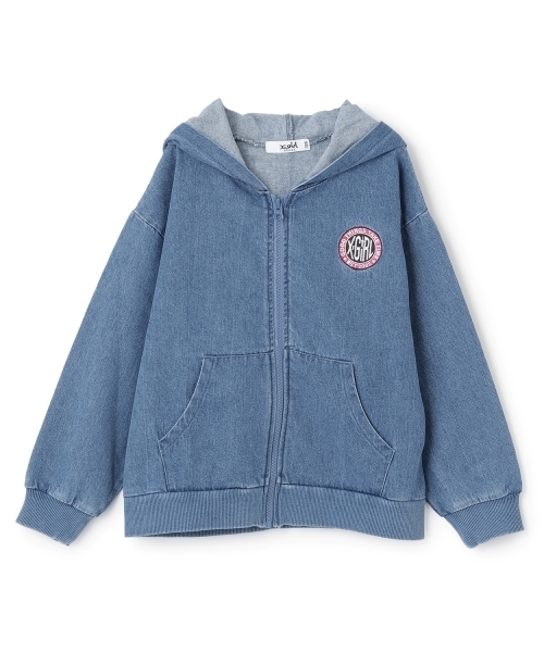 ヴィンテージ感のあるピグメントデニムを使用したフードつきブルゾンです。 前身頃のサークルロゴ刺しゅうと後ろ身頃のビッグロゴプリントがインパクト抜群なデザイン。 軽くてやわらかな風合いなので、サッと羽織れます。 内側にお名前を記入できるタグつき。 【透け感】透けない 【生地の厚さ】普通 【伸縮性】あり 【裏地】なし 【ポケット】あり