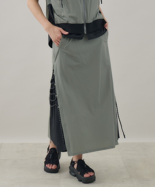 甘さと辛さの二面性、デザインスカート <POINT> コードとドレープが織りなすドラマティックデザイン。 ストレスフリーな履き心地を叶える、こだわりのディテール。 セットアップで広がるスタイリング。 【デザイン・シルエット】 ウエストとサイドで躍動感を描くパラシュートコードが、コーディネートに辛口なエッジを効かせます。 サイドの大胆なスリットからはドレープを描く異素材がふわりとのぞき、女性らしい表情に。 すっきりとシャープな印象でありながら、ボディラインを拾いすぎない絶妙な設計。 ウエストは総ゴム仕様で、リラックスしたイージーな履き心地。 【素材感】 伸縮性に優れたストレッチナイロン素材を使用。 体の動きにしなやかに寄り添い、アクティブな一日もストレスフリーな着心地。 【カラー】 ブラック カーキ 2色展開 【スタイリング】 同素材ベスト(品番:91928)とセットアップで着用すれば、テクニック不要でモードなワントーンコーデが完成。 あえてルーズなトップスを合わせることで、こなれ感のあるストリートMIXスタイルに。 裏地:なし 光沢:なし 伸縮性:あり 透け感:なし 生地の厚さ:普通 ポケット:あり 【33℃】 音楽界に影響を与えた作曲家ジョン・ケージの代表曲‘4分33秒’ 「無音も音楽である」と、音楽の可能性を提示したこの曲と同じように、 洋服にもまだ感じていない可能性があると考えています。 第一楽章の33秒=洋服の持つ可能性の始まりを意味する‘33’ 一目見て体温が上昇するようなワクワク感や、 思わず着たくなってしまうようなアイテムを提案していく想いを‘℃’に込めています♪ ※照明の都合上、多少の色ブレが生じてしまう可能性がございますので、予めご了承くださいますようお願い致します。 --------------------------------------------------- ●お気に入り登録でお得情報を手に入れよう! 「商品のお気に入り登録」をすると、再入荷通知や、ラスト1点の通知、セールの通知など、お得情報が届きます。 また、マイページでいつでも確認が可能になります。 「ブランドのお気に入り登録」をすると、新商品や再入荷、などいち早くブランドの最新情報をお届けします。 ぜひ、ご利用ください。 ----------------------------------------------------
