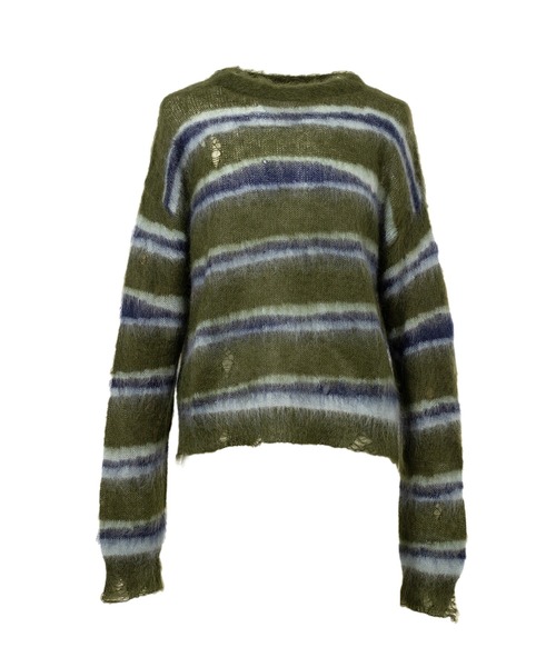【KAMIYA 2025 Autumn/Winter Collection】ディストーテッド ボーダー モヘアニットセーターミドルゲージのモヘヤ混ブラッシュドヤーンニット。歪んだボーダーのデザイン。クルーネック。着用モデル :182 cm着用サイズ : M※商品画像は光の加減やモニター環境により、実際の色味と異なる場合がございます。 ※掲載写真はサンプル品のため、加工やサイズ感に多少の違いが生じる場合がございます。 ※生産時期や個体差により、色味・素材感・仕様にわずかな変化が見られる場合がございます。あらかじめご了承ください。 ※全体に施された穴あきやダメージ、汚し加工は、製品の特性としてデザインに取り入れられたものです。風合いとしてお楽しみください。