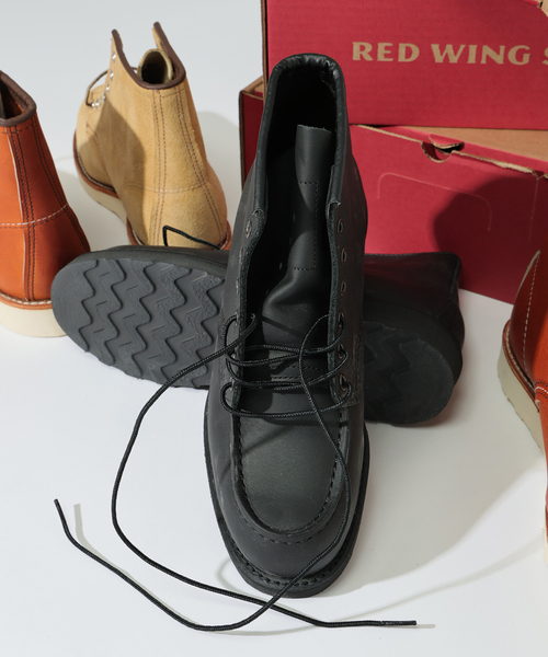 RED WING 6-INCH CLASSIC MOC8074弊社サイズ:メーカーサイズ(US)70(070):775(075):7.580(080):885(085):8.590(090):995(095):9.5100(100):10レッドウィング社は1952年、白く底が平らでクッション性に富むトラクショントレッド・ソールをワーク・ハンティングを用途とする男性用のブーツに初めて導入し発売しました。8インチ丈のブーツ#877です。このブーツは発売と同時に大成功を収め、数年で様々なバリエーションが広がりました。6インチ丈の#875もそのひとつです。モカシンタイプのつま先(モックトゥ)が持つ履きやすさ。どのような場所でも歩きやすく長時間履いても疲れにくいトラクショントレッド・ソール。さらに、良質なレザーや堅牢なつくりがもたらす機能性と耐久性で、#875は#877と共にワーカー達に絶大な支持を得てアメリカを代表するワークブーツとなり、その後約70年近く経った現在でもレッドウィングを代表するブーツとして愛され続けています。クラシックモックのシリーズに新しく仲間入りする#8074は、レザー本来の肌目を活かしたブラックのオイルドレザーであるブラック・ハーネスを使用。レザーに合わせてソールやステッチ、ハトメに至るまで全て黒で統一されたモダンな一足になっています。・レザー:ブラック「ハーネス」・アウトソール:ブラック・トラクショントレッド・インソール:レザー・製法:グッドイヤーレザーウェルト・ラスト(木型):23番・Made in USA※天然皮革を使用しているため、多少の色ムラや、生産過程で生じる傷が多少ある場合がございますので、予めご了承ください。※アメリカ本国ハンドメイドの為、ステッチの若干の曲がり、ホツレなどがある個体が存在しますが、風合いとしてご了承ください。※表面に特有の白いブルーム(ロウ)が浮くことがありますが、ご使用やブラッシングなどお手入れにてすぐに馴染みます。※その他の【RED WING / レッドウイング】アイテムはこちら!品番:25093465000430商品名:RED WING / レッドウイング 6インチ クラシックモック #0875品番:25093465000530商品名:RED WING / レッドウイング 6インチ クラシックモック #8833【RED WING / レッドウイング】1905年、アメリカ、ミネソタ州レッドウィングでチャールズ.ベックマンによって設立。創業当時からクオリティーの高さと機能的なデザインは高い評価を受けています。《画像についてのご注意》※照明の関係により、実際よりも色味が違って見える場合があります。またパソコン・スマートフォンなどの環境により、若干製品と画像のカラーが異なる場合もございます。※商品の色味は、商品アップ画像をご参照ください。《商品のお気に入り登録について》「カートに入れる」または「予約する」右側のハートマークを押していただくと、再入荷、残り1点、セールなどの通知を受け取ることが出来ます。