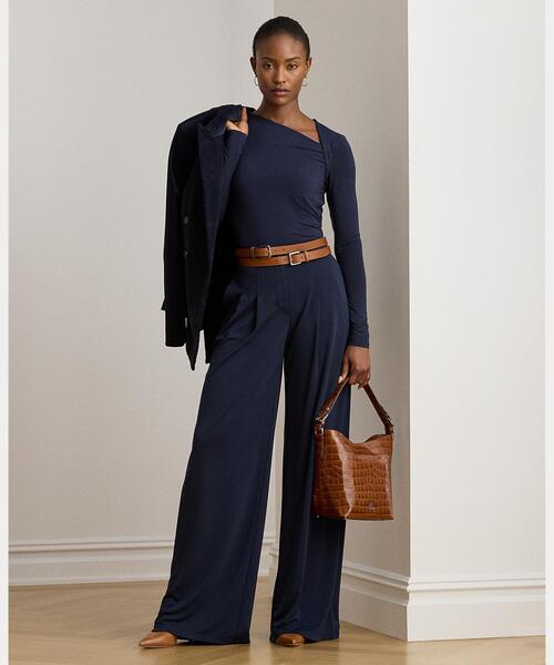 張り感のあるプリーツがアクセントを添えるパンツ。ストレッチジャージー素材にワイドレッグのシルエットを組み合わせ、流れるようなドレープを実現。・ミッドライズ / ワイドレッグのシルエット / フロア丈。・ボタン留めジップフライ / 特別に開発した"Lauren Ralph Lauren"のロゴ入りボタン。・サイドシームポケット / ウエスト背面に箱ポケット2つ。・フロントウエストにプリーツ / ウエスト背面にダーツ。・リサイクルポリエステルを使用した商品。・モデル身長178cm、着用サイズ4。※商品の色味は、光のあたり具合など諸条件により色感が多少異なって見える場合がございますので予めご了承下さい。