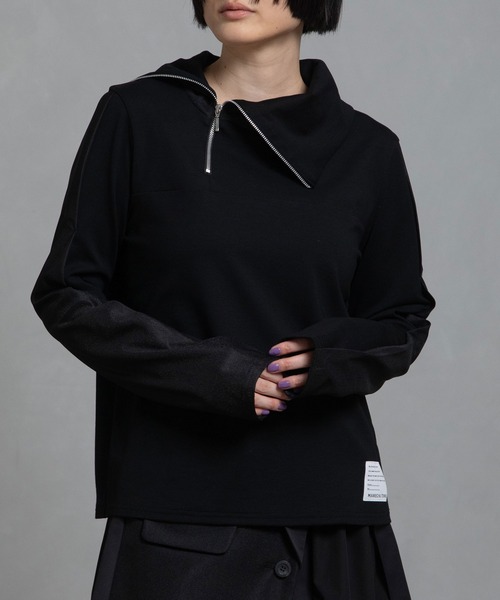 ■2025 AUTUMN WINTER collection■チュールとオーガンジーを部分的に重ねたスキッパートップスファスナーで衿の雰囲気を変えられる2wayアイテム落ち着いたトーンのバイカラーが、日常にすっと馴染みながらも、デザイン性のあるディテールが魅力的な一枚。最大のポイントは、衿元に施されたファスナー仕様。スタンドカラーとしてきちんと感を演出したい日には、ファスナーをしっかり閉じてシャープな印象に。一方で、ファスナーを少し開ければ、抜け感のあるラフな雰囲気に早変わり。その日の気分やシーンに合わせて、表情を自在に変えられます。【DESIGN】■衿のファスナーを上げると口元まで隠れるので首元の防寒にも■ファスナーを下げると倒した衿が大きくアシンメトリーに開きになる■衿、後袖にチュール / オーガンジーをレイヤード■前振りにした後袖の別地がつくるシルエットも個性的なデザインポイント■すっきりとしたサイズ感でありながらストレッチ性のある素材を使用しているので動きやすさもキープ■左裾上にブランドネームでアクセント【MATERIAL】(表地)抗ピル性に優れたレーヨンを高密度に編み上げたコンパクトなポンチ素材を使用・適度な肉感とハリ感が特徴・ストレッチ性が豊かで着心地と肌触りが良い・膨らみをもちつつ、滑らかにフィットする素材(別地: gry/nvy) 目が細かく、適度なハリを持つ薄手チュール素材を使用・上品なドレープ感と透け感が高級な印象を与える素材感(別地: blk/khk)トレンドのシアー感を取り入れた繊細なトリコットオーガンジーを使用・糸や組織で表現された独特なシボ感が印象的・ヴィンテージライクで綺麗さも保ちつつ、ストレッチ性も兼ね備えた素材--------------------------裏地:なし光沢感:微光沢あり透け感:なし伸縮性:あり生地の厚さ:薄手ケア方法:ホームクリーニング(手洗い)--------------------------◆お取り扱いについては商品についております品質表示にてご確認下さい。*光のあたり具合いやパソコンなどのモニター環境によって実際の色味と異なって見える場合がございます。予めご了承ください。*撮影時はサンプルの為、若干のデザイン変更等ある場合がございます。予めご了承ください。<INFORMATION>◆商品のお気に入り登録お気に入り登録していただいた商品は、完売商品の再入荷通知やラスト1点の通知、またクーポン発行やタイムセールの通知もお届け!ぜひご登録してください。◆ショップ・ブランドのお気に入り登録新商品や再入荷、ショップ・ブランドのお得な情報をいち早お届け!ぜひご登録してください。