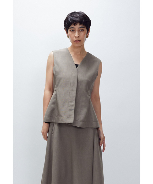 コンパクトなペプラムシルエットのジレ。 ブラウス感覚で着て頂けるようにⅤ空きや、アームホールをインナーが見えすぎない位置にしています。 気温の変化によりタートルネックなどを入れて着て頂いても◎ 前を閉じて着て頂くバランス感がおすすめ。 シリーズのスカートとの着用もでき、デニムなどのカジュアルなボトムや合繊パンツなども相性ばっちりです。 【お取り扱い】 ドライクリーニング 〇シリーズのご案内〇 アシンメトリータックスカート ********************* 透け感:なし 裏地:なし 伸縮性:なし 光沢感:なし 生地の厚さ:普通 ********************* Model:165cm 着用サイズ:38