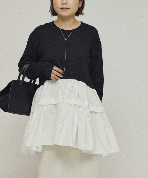 2025 Fall & Winter itemFirsthand定番のオーガニックコットン天竺素材を使用した、肌触りの良いカットソートップス●カットソーと布帛素材をドッキングした異素材ミックスデザインが魅力●カットソーならではのリラクシーな着心地と、布帛のティアードディテールによる上品な印象を両立●一枚でしっかりと“きちんと感”があり、デイリー使いにもお出かけにも活躍●ややコンパクトなシルエットで、ニットやスウェットのインナー使いにも最適●裾のティアード部分をレイヤードでちらっと見せるコーディネートもおすすめ●シンプルながら立体感のあるデザインで、着こなしのアクセントになる一枚おすすめコーディネート春夏は一枚で着て、ボトムスはすっきりとしたスラックスやストレートデニムを合わせると、ティアードのボリューム感が引き立ち、バランスよく着こなせます。足元はバレエシューズやローファーで、きれいめカジュアルにまとめるのが◎。秋冬は、ニットやスウェット、ベストと重ねて裾のティアード部分をちらっと覗かせるスタイリングがイチ押し。コンパクトなシルエットなので、オーバーサイズのトップスと重ねてももたつかず、こなれ感のあるレイヤードスタイルに仕上がります。スカートと合わせる場合は、タイトスカートで上下にメリハリをつけるか、裾が広がりすぎないフレアスカートを選ぶとバランスが取りやすく、よりフェミニンな印象に。小ぶりなショルダーバッグや華奢なアクセサリーをプラスすれば、さりげなく女性らしさを引き立てる着こなしが完成します。季節を問わず、スタイリングの幅が広がる一枚です。【環境に配慮したサステナブルアイテムです】オーガニックコットンを使用したエコアイテムです。※掲載画像の商品の色味は、屋外や屋内の光の照射や角度により実物と色味が異なる場合がございます。また表示のサイズ感と実物は若干異なる場合もございますので、予めご了承ください。※着用、お取り扱いの際は、商品についている品質表示とアテンションタグを必ずご確認下さい。【Firsthand / ファーストハンド】Fashion , Sustainable , Art をテーマに、デザイン性やクォリティー、モノ作りなど、クリエイティブを重視したサステナブルなコンセプトストア。 ここでしか出会えないブランドやアイテム、ここでしかできない実体験、新しくスタイリッシュなカルチャーとファッションをここから発信していきます。フリークスストア等を構えるデイトナインターナショナルから新たに発信されるブランドです。