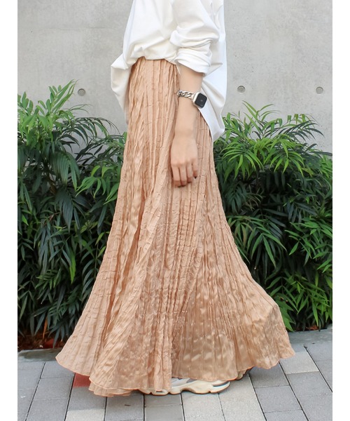 ランダムなシワプリーツを施したマキシ丈の女性らしいスカート■デザイン ふんわりとした柔らかく程よい光沢感の素材が上品な雰囲気に仕上げてくれ、ニットとの相性も抜群なアイテムです。シンプルなトップスも映えるスカートはスタイリングに取り入れるだけで女性らしい印象と気分を盛り上げてくれます。ウエストゴムでイージーな穿き心地も嬉しいポイント。■生地感 微光沢のある極薄デシンを使うことで、プリーツ加工を施しても重くなりすぎず、軽やかな履き心地に仕上げています。■サイズ感 程よいボリューム感ですっきりとした印象のシルエットはデイリーに着やすいシルエットです。・・・・・・・・・・・・・・・・・・・・・・透け感:ややあり裏地:あり伸縮性:あり光沢感:あり生地の厚さ:普通・・・・・・・・・・・・・・・・・・・・・・※商品画像はサンプルのため、色味やサイズ、素材の混率等の仕様に変更がある場合がございます。予めご了承ください。※生地寄り画像を正規の商品の色味に近づけております。■商品のお気に入り登録再入荷通知やラスト1点、お得なプライスダウンの情報も受け取ることができます。ぜひご登録ください◎