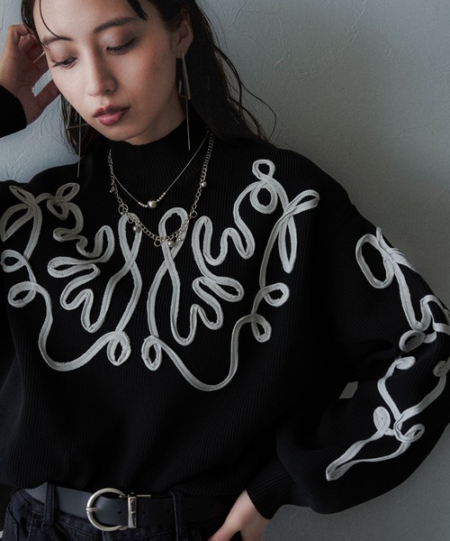 ーーー インパクトのあるコード刺繍がポイント モードな今年らしいデザインニット ーーー point □大き目のコード刺繍が特徴的なニットトップス □モックネックのデザインで冬場も首元が暖かく、またスタイリッシュな印象に □ゆったりとしたシルエットとボリューム感のある袖で、リラックス感をプラス □張り感のあるポリエステル100%のしっかりとした素材の為、軽く、型崩れしにくいのがポイント styling 骨格ナチュラル: ワイドパンツなどのゆったりとしたボトムでカジュアルなスタイリングがおすすめ◎デニムジャケットやオーバーサイズのテーラードジャケットでトレンド感のあるスタイリングに。 骨格ウェーブ:フレアスカートやプリーツスカートで優雅さをプラス。ショート丈のジャケットで腰位置を高く見せ、脚長効果抜群◎ストラップシューズやバレエフラットで女らしさと軽やかな印象に。 骨格ストレート:ハイウエストのストレートジーンズやタイトスカートで、クリーンでシンプルなラインを作り、ニットをインしてウエストを強調すると◎ミディ丈のコートやストレートなカットのジャケットでスタイリッシュに。 ※加工を施した画像を使用しております。 実物と色味が異なる可能性があるため、色味は詳細後ろにある生地寄り画像を参考にお願いいたします。 あらかじめご了承下さい。