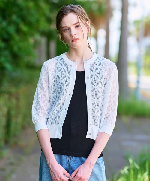 《繊細なレース柄が美しい、さらりとした着心地のハーフスリーブカーディガン》 ●ドレステリアのアイコンをレース編みで品よく表現した特別感のある一着 ●透明糸を用いたレース編みで見た目にも清涼感のあるカーディガン ●強撚糸のコットンをハイゲージに編み立てたさらりとした質感 ●こだわり ドレステリアのアイコン、『オーバーラップサークル』柄をダブルジャカードという特殊な編み方で表現した清涼感のあるレース編みのカーディガン。 透明糸の透け感が涼し気でノースリーブのワンピースやTシャツなど、暑い時期の羽織りものとして丁度良い素材です。 初秋まで対応出来る5分袖丈と程よいコンパクトボディのショート丈で、ワイドパンツやロングスカートなどボトムとのバランスがとり易く、長い夏に対応出来るアイテムに仕上げました。 ●素材 強撚の綿糸と透明糸使用し、繊細な柄をダブルジャカードという特殊な編み方で表現。 オーバーラップサークル柄を程よいシアー感と表面の凹凸で表現した特別感のある素材です。 背中部分は16ゲージというハイゲージの天竺組織であえて透けさせない事で、後ろ姿に変化をつけています。 ※照明の関係により、実際よりも色味が違って見える場合があります。また、パソコン・スマートフォンなどの環境により、若干製品と画像のカラーが異なる場合もございます。 店舗へのお問い合わせ商品番号:085-33005 ●製品寸法: 34(SS):着丈45cm B86cm 袖丈35cm 肩幅34cm 36(S):着丈47cm B90cm 袖丈36cm 肩幅35cm 38(M):着丈49cm B94cm 袖丈36cm 肩幅36cm 備考: