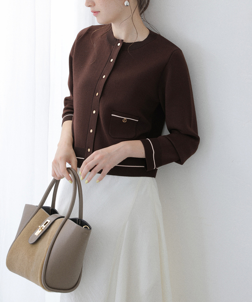 【2025AW】 La Totalite 昨シーズン人気だったカーディガンがNEWデザイン、ALL新色で再登場! ※こちらは品番:25080140238010のと同型の商品です。 好印象な大人スタイルを確立するニットカーデ。 裾と袖口に加え、今シーズンはポケットにもバイカラーのラインをプラス。 コーディネートにメリハリを足し華やかな印象を与えてくれます。 ポケットにはLaTotaliteオリジナルチャームをあしらい、さりげないアクセントポイントに。 上半身をスッキリ見せるコンパクトな着丈は、ワイドパンツやフレアスカート等のボリューム感のあるボトムとの相性抜群。 ボタンを閉じたプルオーバー風な着こなしから、ワンピースに羽織った上品スタイルまで、一枚で着回しのバリエーションが広がります。 シーンを選ばずオンオフ活躍する、大人女子のワードローブに欠かせないアイテムです。 ********************** 透け感:なし 裏地:なし 伸縮性:あり 光沢感:なし 生地の厚さ:普通 ********************** 【スタッフ着用コメント】 《スタッフ名:yukimi》 身長:160cm/体型:普通/普段サイズ:S~M/着用サイズ:フリー サイズ感:スッキリとしたシルエットで着こなせる丁度良いサイズ感。身体のラインは出ないので安心です。 素材感:適度に肉感のあるハイゲージニット。柔らかく、サラッとした肌触りです。 着心地:コンパクトなサイズ感ですが、窮屈感なく快適な着心地でした。 ********************** ※お取り扱いについて カラー:ブラウン 着用中の摩擦や、汗、水濡れにご注意ください。濡れたままの状態で擦れると、色移りすることがあります。 ※取り扱いについては、商品についている品質表示でご確認ください。 ※照明の関係により、実際よりも色味が違って見える場合があります。 またパソコン・スマートフォンなどの環境により、若干製品と画像のカラーが異なる場合もございます。 ※商品の色味は、商品アップ画像をご参照ください。 着用モデル身長:164cm 着用サイズ:フリー 本体:手洗い可能