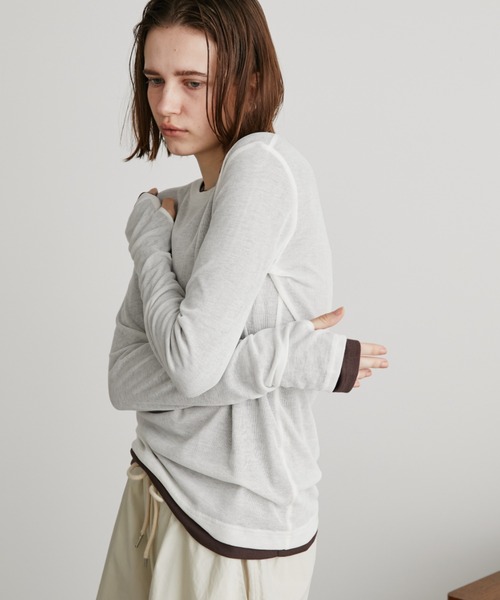 今シーズンは新色の"ブラウン・グレー"が登場。普段使いに大活躍間違いなしのシアーリブサムホールプルオーバー■design程よくフィットするサイジングながらも伸縮性があり、快適な着心地のシアーカットソー。一枚でも、レイヤードスタイルのインナーとしても使いやすい程よい透け感で今っぽい印象に仕上げました。手元にはサムホールが開いており親指を出せる仕様になっております。シンプルなデザインなので一枚持っておくと重宝する着回し力抜群なロングスリーブTシャツです。■material透け感とストレッチ性のあるカットソー素材。軽やかでストレスフリーな着心地です。■styling一枚でロンTのようにご着用いただくのはもちろん、スウェットやニットの中にレイヤードして袖口からチラ見せさせるスタイリングもおすすめ。コンパクトなシルエットなのでボトムスはボリューム感のあるデニムやイージーパンツとの合わせがバランス良くまとまります。透け感:あり光沢感:なし伸縮性:あり裏 地:なし厚 み:薄手フィンガーホール/サムホール/ベーシック/フィットトップス/レイヤード/冬服/春服---------------------------------------------------▶商品のお気に入り登録完売カラーの再入荷通知やラスト1点の通知などお得なプライスダウンの情報も受け取ることができます。ぜひご登録ください◎▶ブランドのお気に入り登録新商品や再入荷など、ブランドの最新情報をいち早くお知らせします!ぜひご登録ください◎---------------------------------------------------※撮影環境の光や角度により、実物と色味が異なる場合がございます。※着用、お取り扱いの際は、商品に付いている品質表示を必ずご確認ください。※生産時期により色味・加工感など多少異なる場合がございます。予めご了承ください。